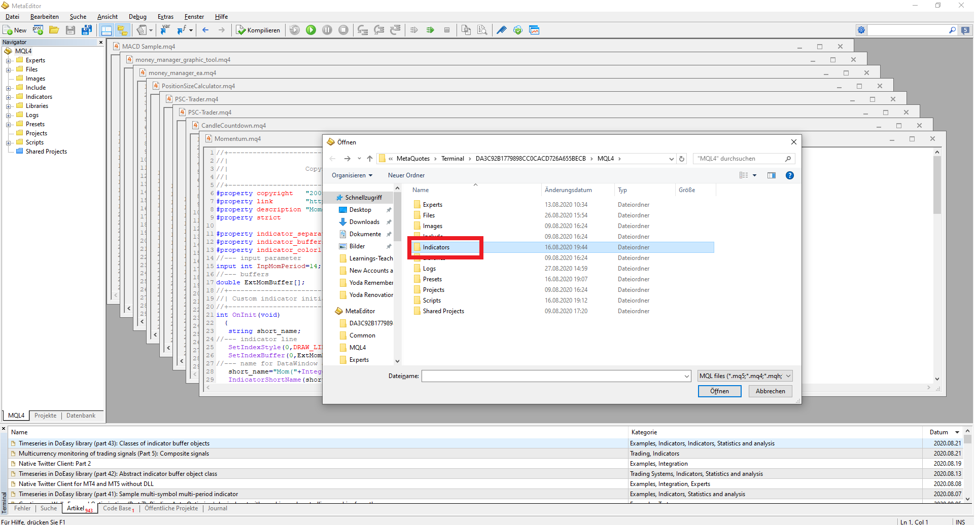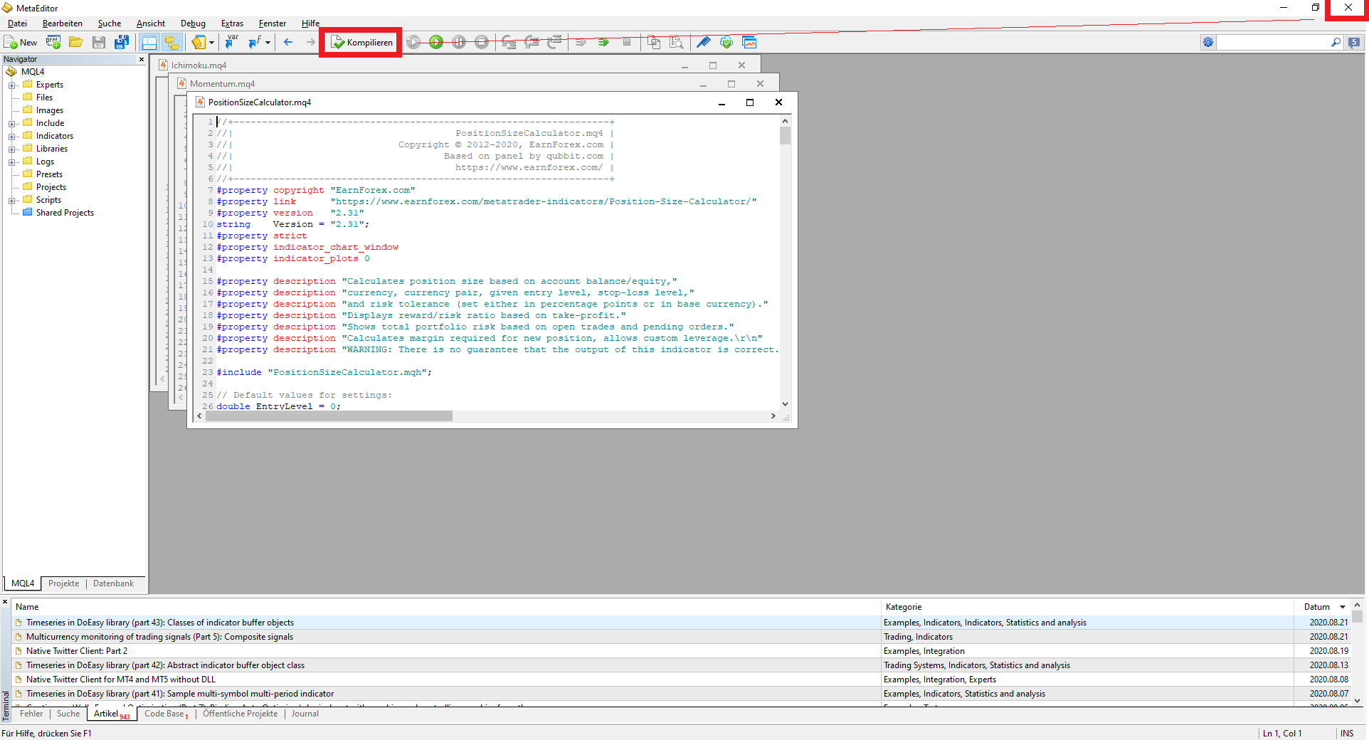 - Go to the Navigator in the left lower corner, rightclick on “Momentum”, then -> modify. A new window opens. If there is a popup saying MQL Wizard, just cancel this box.
