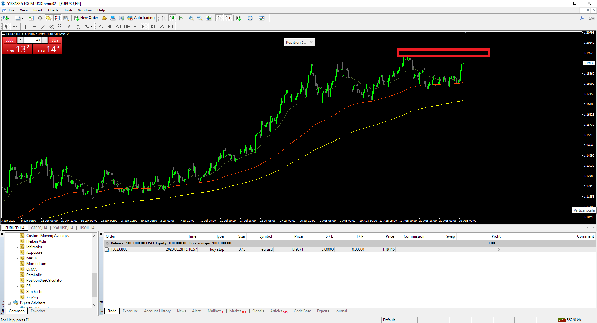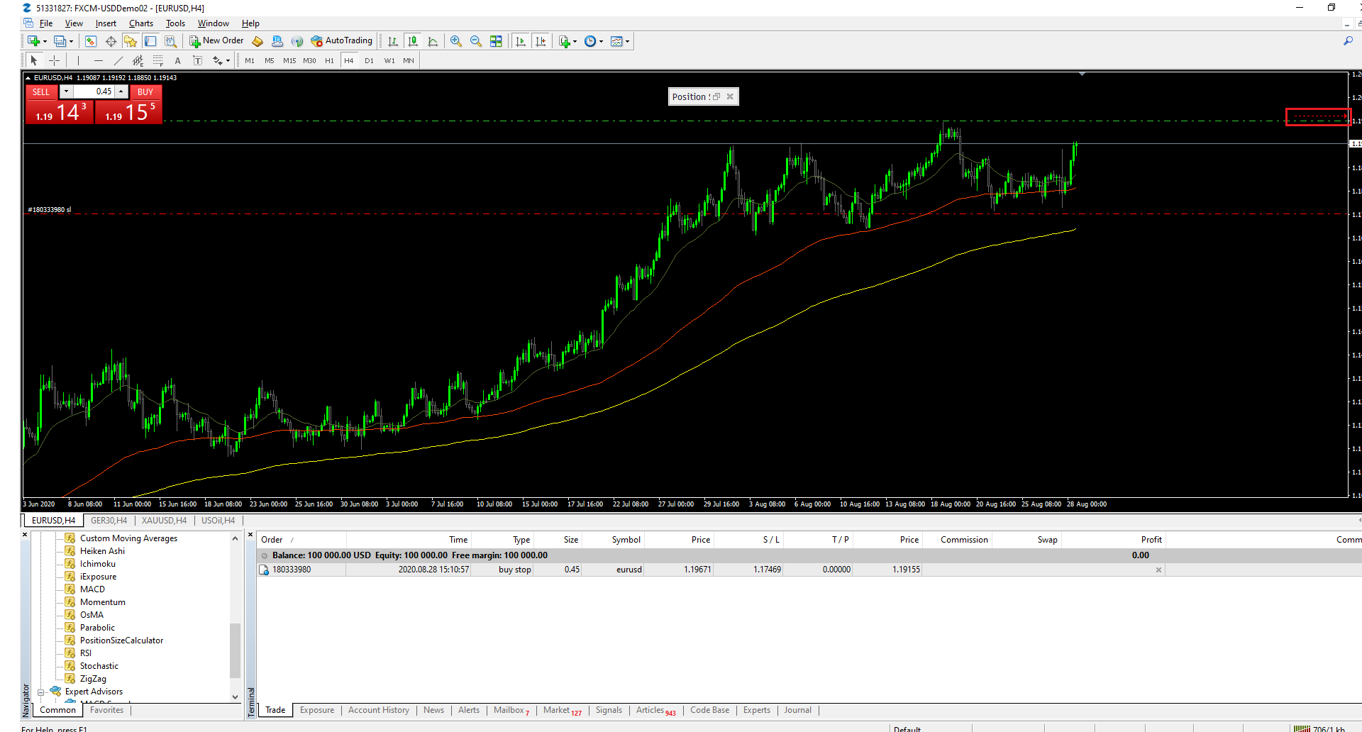 - When you do it the first time the program asks to accept terms and conditions. If you do that, nothing happens. So repeat the same process again, rightclick -> Trade -> Buy Stop. You should now see the green dotted line in the chart.