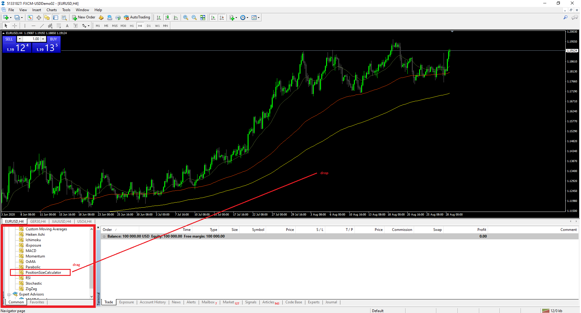 - Drag & Drop the PositionSizeCalculator file into the chart