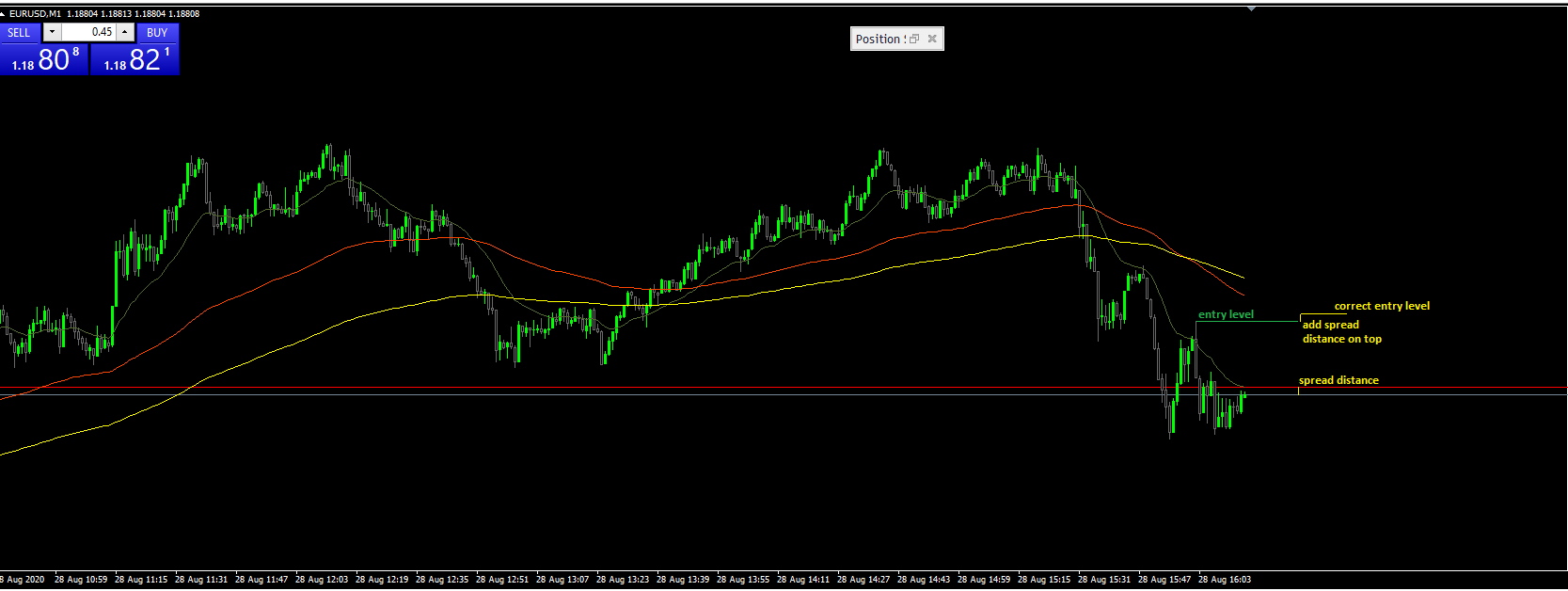 This is easy to understand, fees simply are part of trading. It gets a little more complex with order setting. When you enter short, everything is easy, but if you want to enter long, you have to add the spread on top of your buy trigger. Example below:
