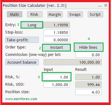 - Download the Position Size Calculator here: https://www.earnforex.com/mt4-forex-indicators/PositionSizeCalculator.zip