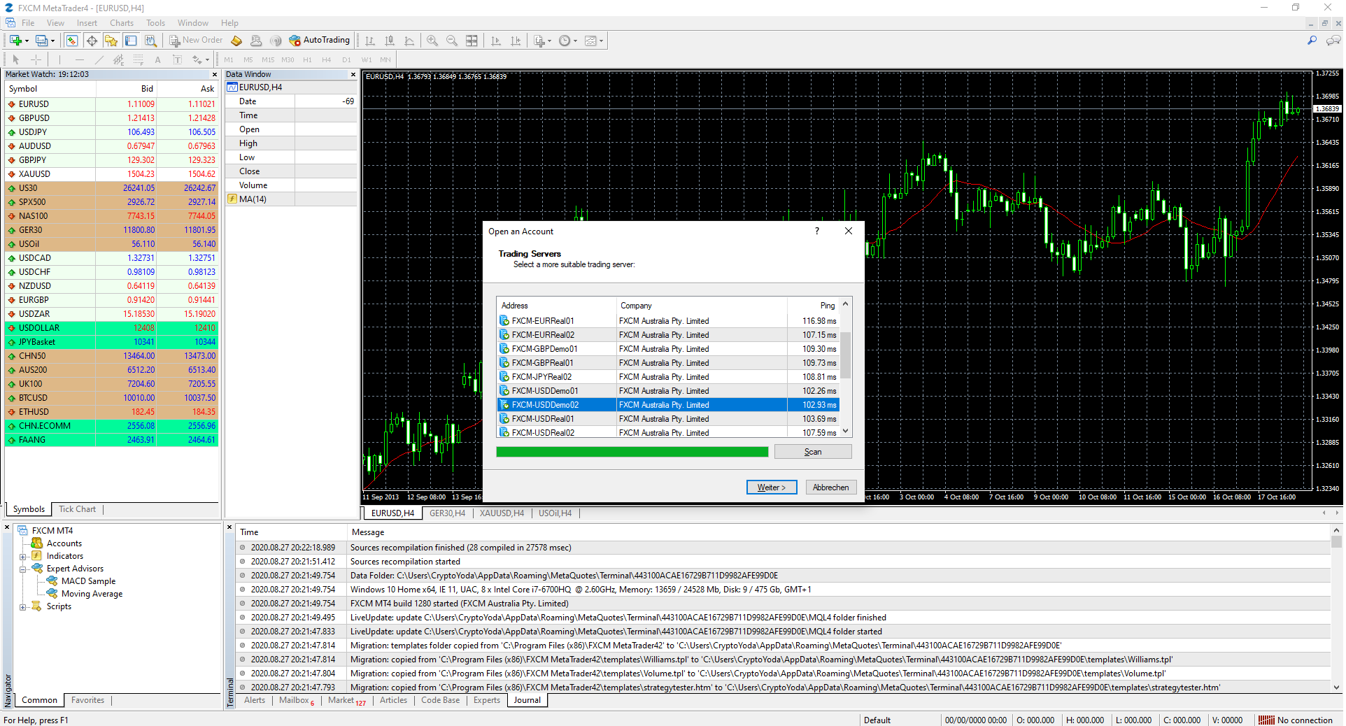 First of all, if you want to change the language to English, go to the upper left and click on “View” in the menu (or however it is called in your language), then -> Languages -> English. Then restart MT4 before resuming.