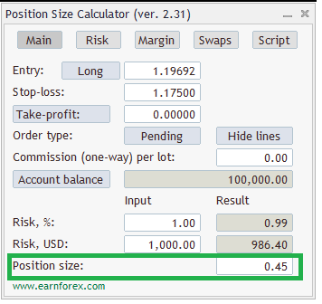 - The Position Size Calculator now shows how many contracts you can buy according to your defined risk, in this case 0.45 contracts in EURUSD.