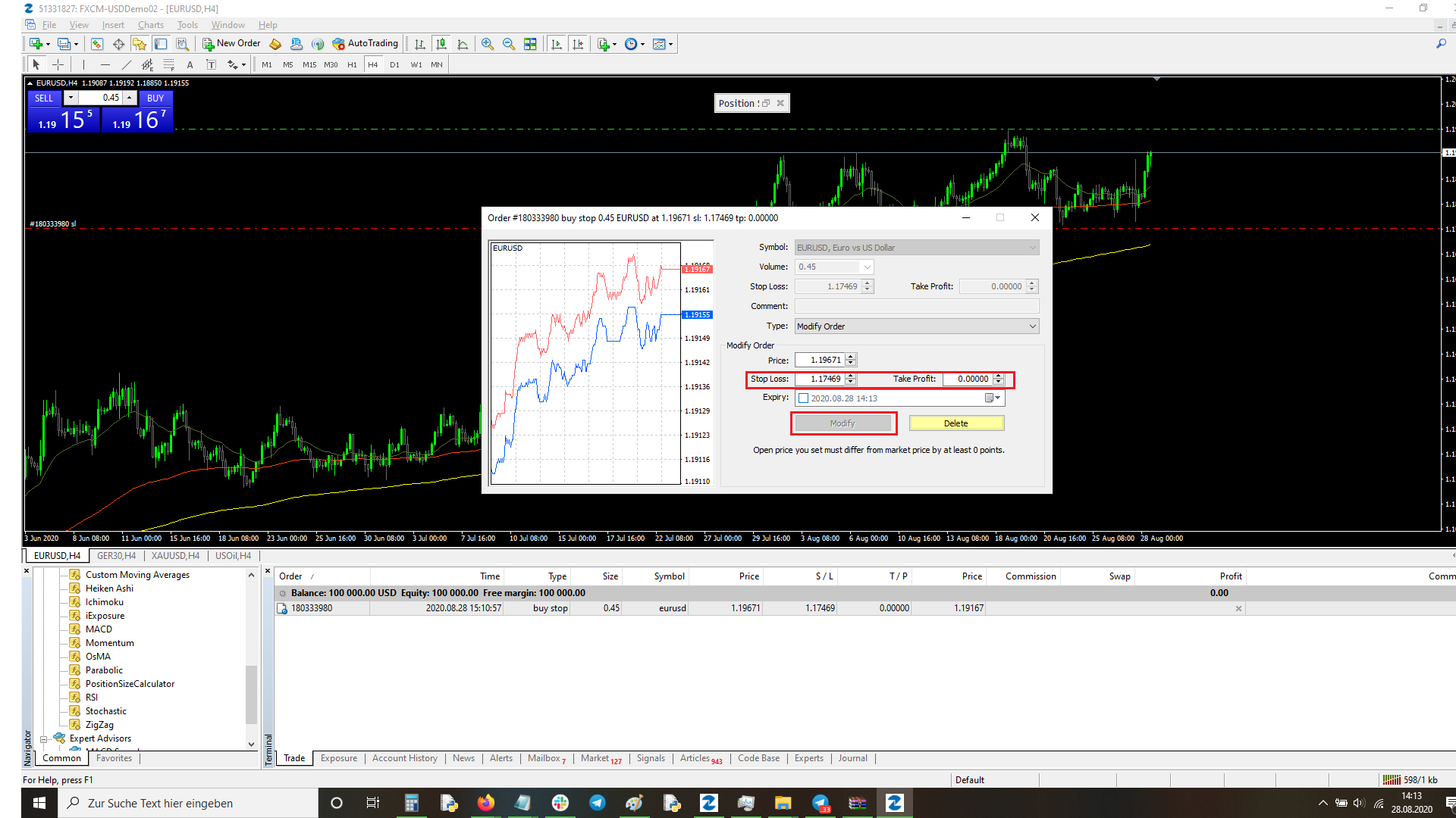 - Doubleclick on the now appeared order line, put in your Stoploss (and optionally Take Profit) -> modify.